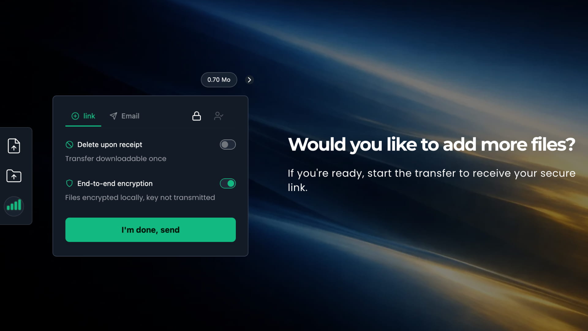Activez E2EE en quelques clics pour que vos fichiers soient chiffrés avant de quitter votre navigateur.