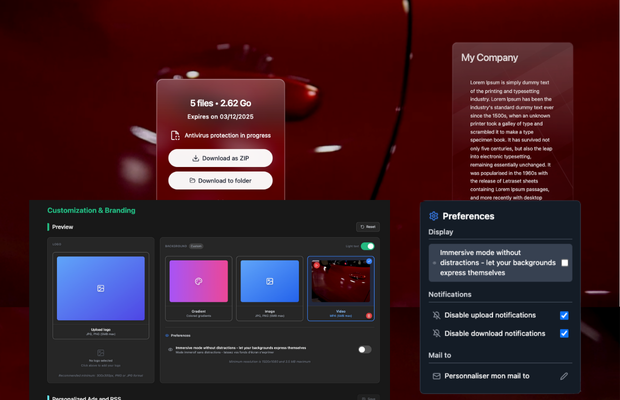 Personnalisez complètement la page de téléchargement : logo de votre entreprise, couleurs de votre charte graphique, vidéo de fond personnalisée (max 5MB), messages promotionnels. Mode immersif activable depuis l'accueil pour laisser place nette à votre vidéo ou votre branding personnalisé. Expérience 100% cohérente avec votre identité de marque, zéro publicité concurrente.